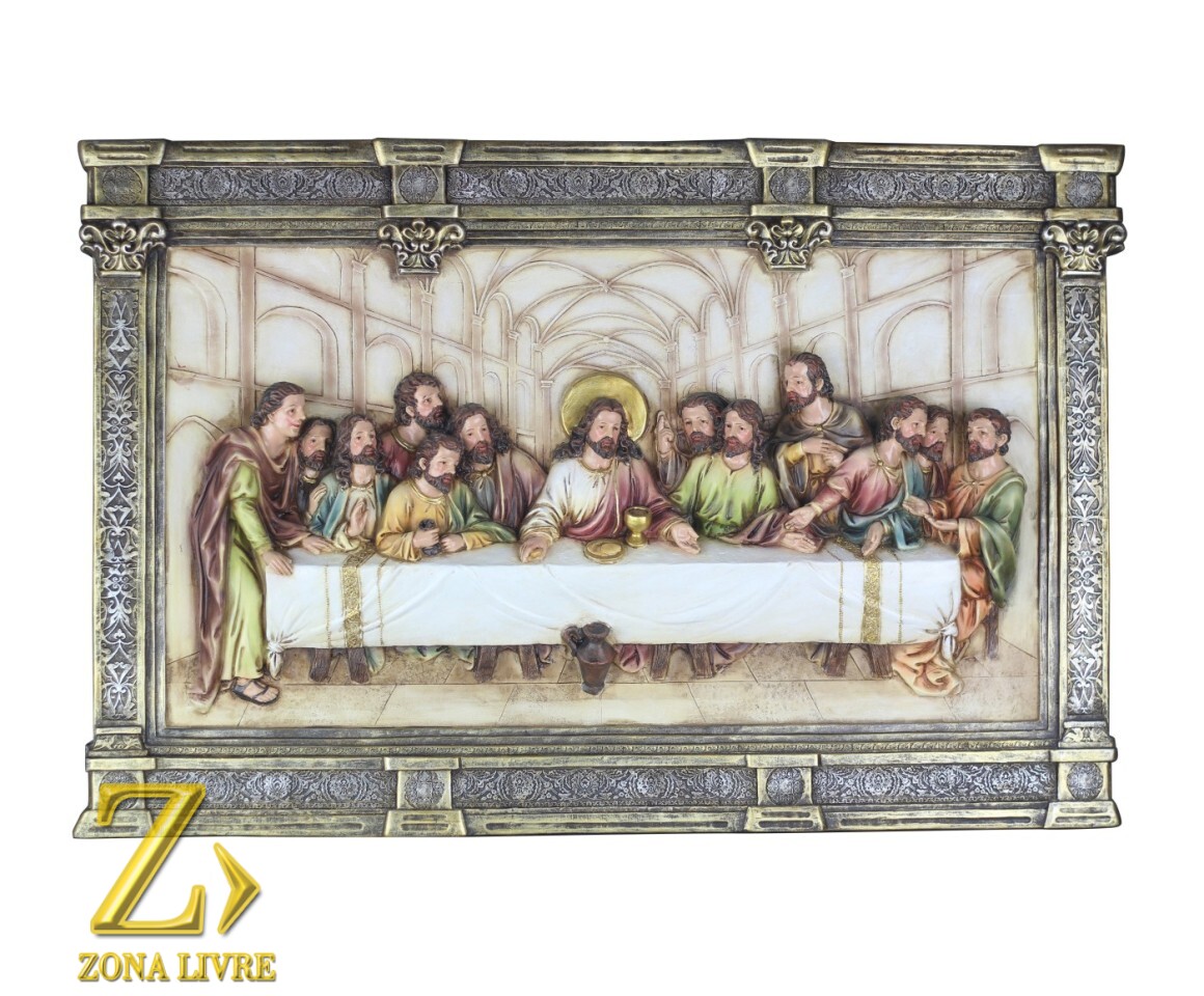 O quadro que retrata a Santa Ceia feito de resina é uma representação artística da icônica cena bíblica. Na obra, os personagens são esculpidos em relevo, conferindo uma sensação tridimensional à pintura. O quadro é elaborado com uma mistura de resina e pigmentos, resultando em cores vibrantes e durabilidade. A cena da Santa Ceia é meticulosamente recriada, com Jesus Cristo no centro da mesa, rodeado por seus discípulos. Detalhes como as expressões faciais, gestos das mãos e vestimentas são cuidadosamente trabalhados, transmitindo realismo à obra.