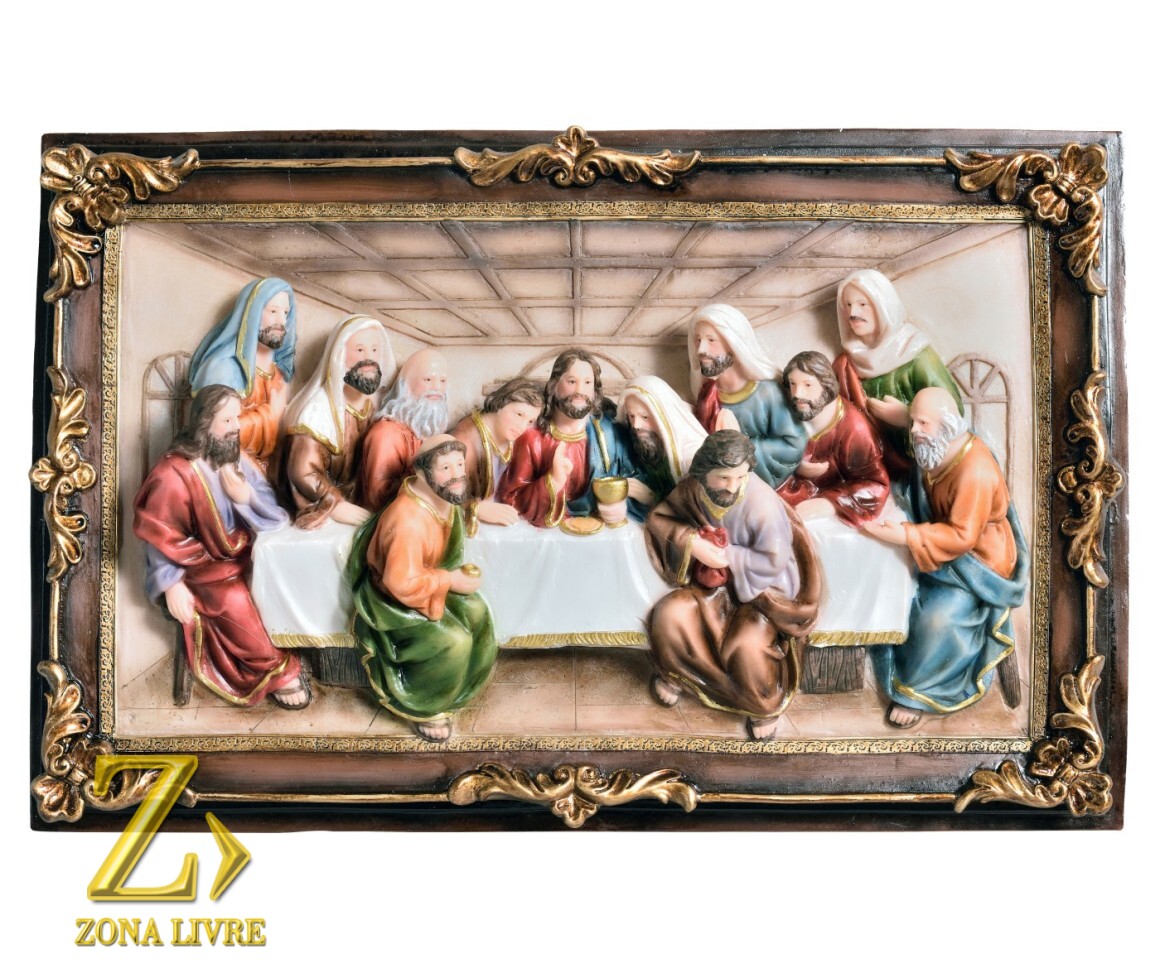 O quadro que retrata a Santa Ceia feito de resina é uma representação artística da icônica cena bíblica. Na obra, os personagens são esculpidos em relevo, conferindo uma sensação tridimensional à pintura. O quadro é elaborado com uma mistura de resina e pigmentos, resultando em cores vibrantes e durabilidade. A cena da Santa Ceia é meticulosamente recriada, com Jesus Cristo no centro da mesa, rodeado por seus discípulos. Detalhes como as expressões faciais, gestos das mãos e vestimentas são cuidadosamente trabalhados, transmitindo realismo à obra.
