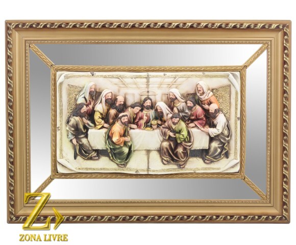 O quadro que retrata a Santa Ceia feito de resina é uma representação artística da icônica cena bíblica. Na obra, os personagens são esculpidos em relevo, conferindo uma sensação tridimensional à pintura. O quadro é elaborado com uma mistura de resina e pigmentos, resultando em cores vibrantes e durabilidade. A cena da Santa Ceia é meticulosamente recriada, com Jesus Cristo no centro da mesa, rodeado por seus discípulos. Detalhes como as expressões faciais, gestos das mãos e vestimentas são cuidadosamente trabalhados, transmitindo realismo à obra.