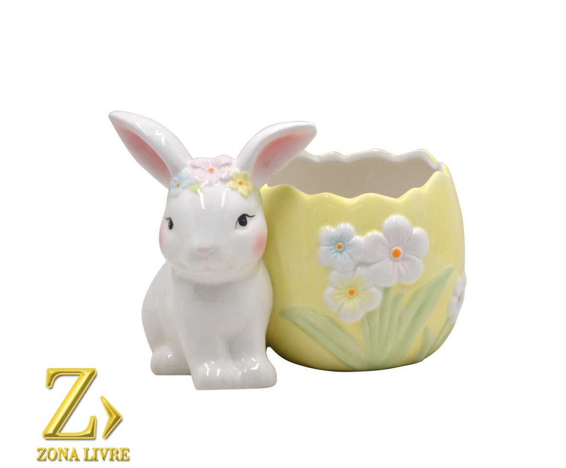 O Cachepot Coelho Amarelo une delicadeza e charme, trazendo um coelhinho branco detalhado ao lado de um ovo amarelo com flores coloridas em alto-relevo. Ideal para enfeitar mesas, criar arranjos pequenos e complementar ambientes temáticos, principalmente na Páscoa.