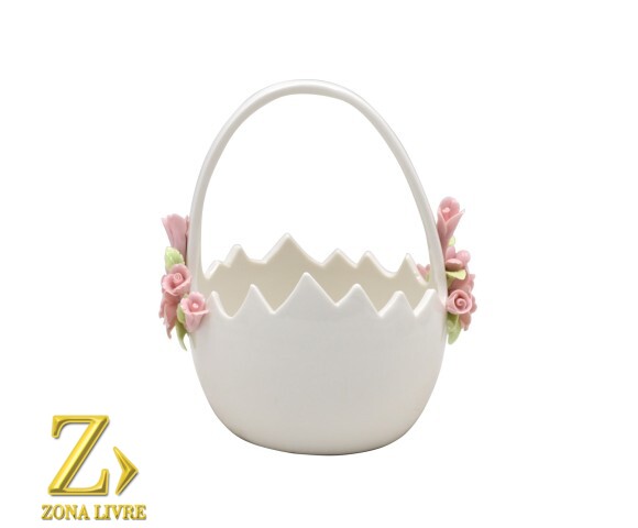 Possui alça fixa decorada com pequenas flores em tons pastel, tornando-o perfeito para composições românticas, decoração de Páscoa, arranjos florais ou como peça decorativa em mesas e estantes.