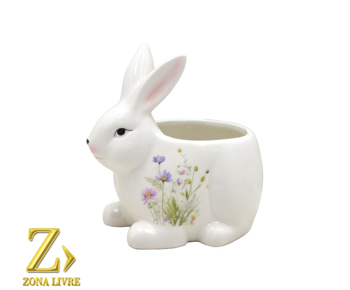 O Coelho Cachepot Florido é uma peça decorativa charmosa em cerâmica branca, ideal para quem busca um toque delicado e primaveril na decoração.